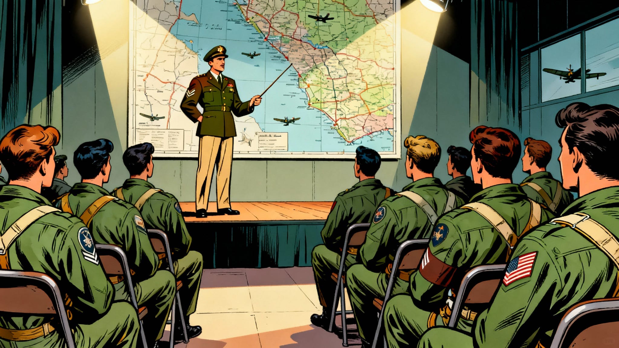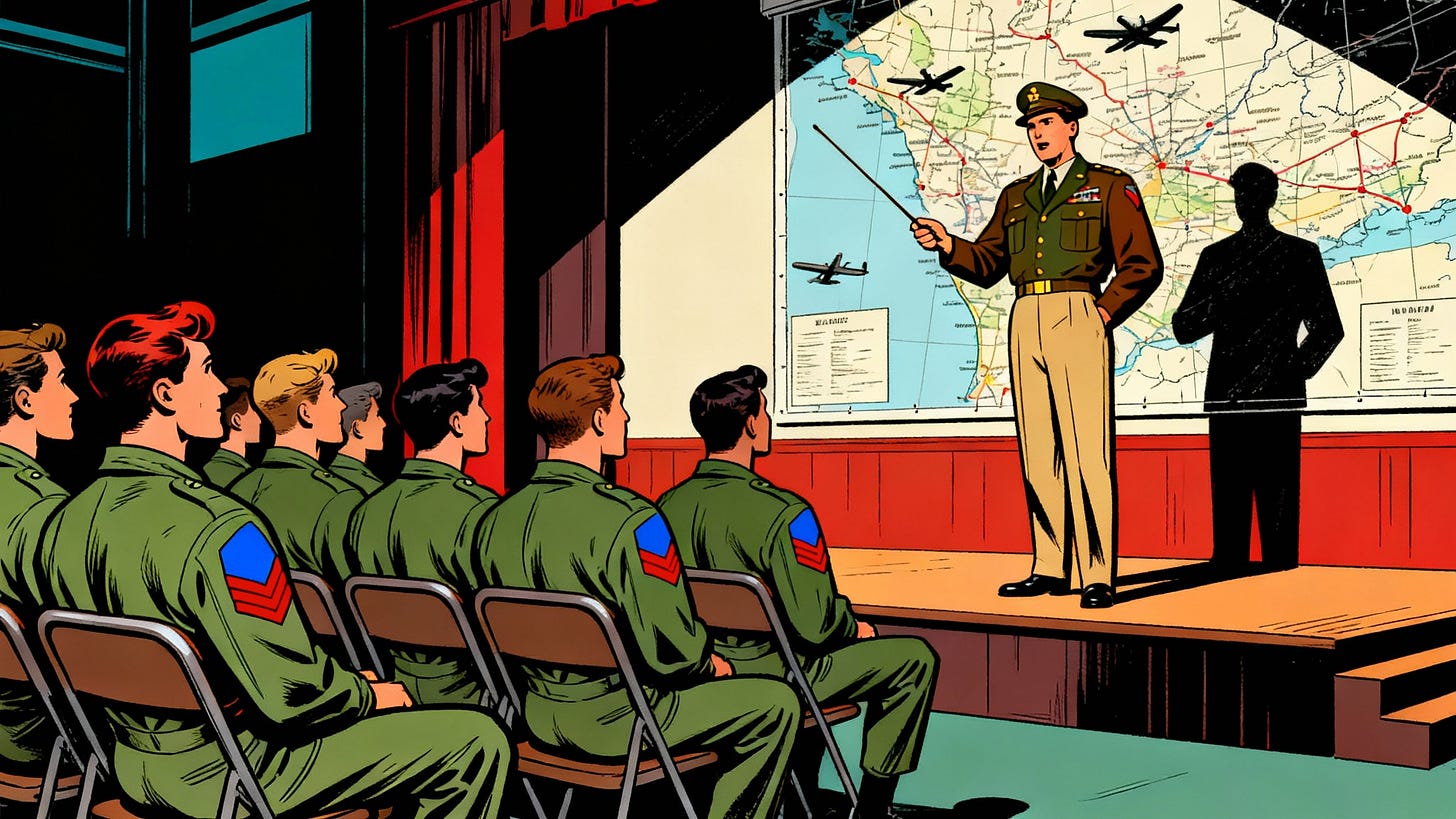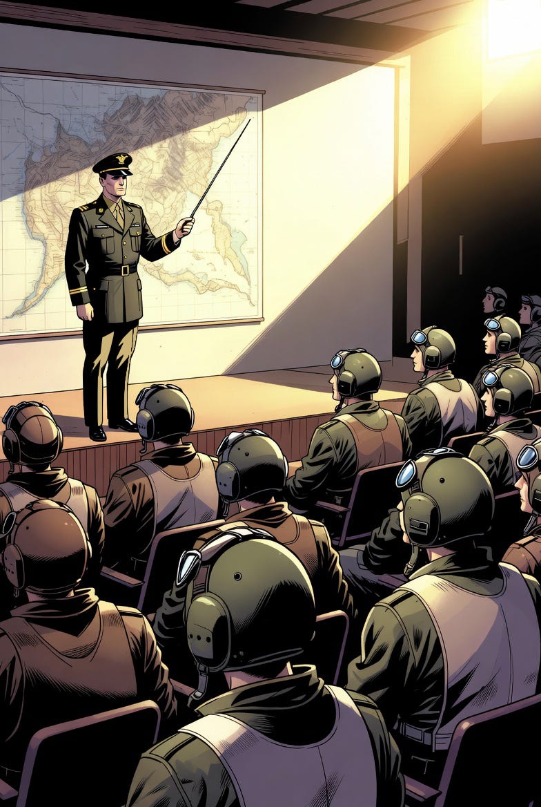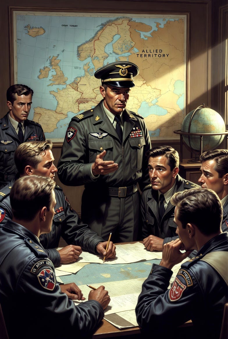I probably went through 40 images before getting this one, then about 10 videos before getting one I settled for. AI goofiness included it hopelessly distorting the map of Fortress Europe; putting chevrons on the officers; getting the uniform colors wrong; showing pilots wearing Class A uniforms (including neckties) with their flight helmets; wearing headsets during the briefing or helmets partly made of their hair; the commanding officer stepping off the stage onto thin air; all the pilots responding vocally in unison, “Yes sir; about time!” all of them moving in perfect synch—including universal left-handed writing.